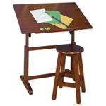 13257 Features: -Table and stool set. -Walnut finish. -Hardwood and plywood construction. -Drop down pencil ledge . -Floor levelers adjust to uneven surfaces. -Solid wood construction for stability. -Includes 22'' tall stool. -Assembly required. -Manufacturer provides 10 years warranty. -Adjustable angle worksurface dimensions: 36'' W x 24.25'' D.